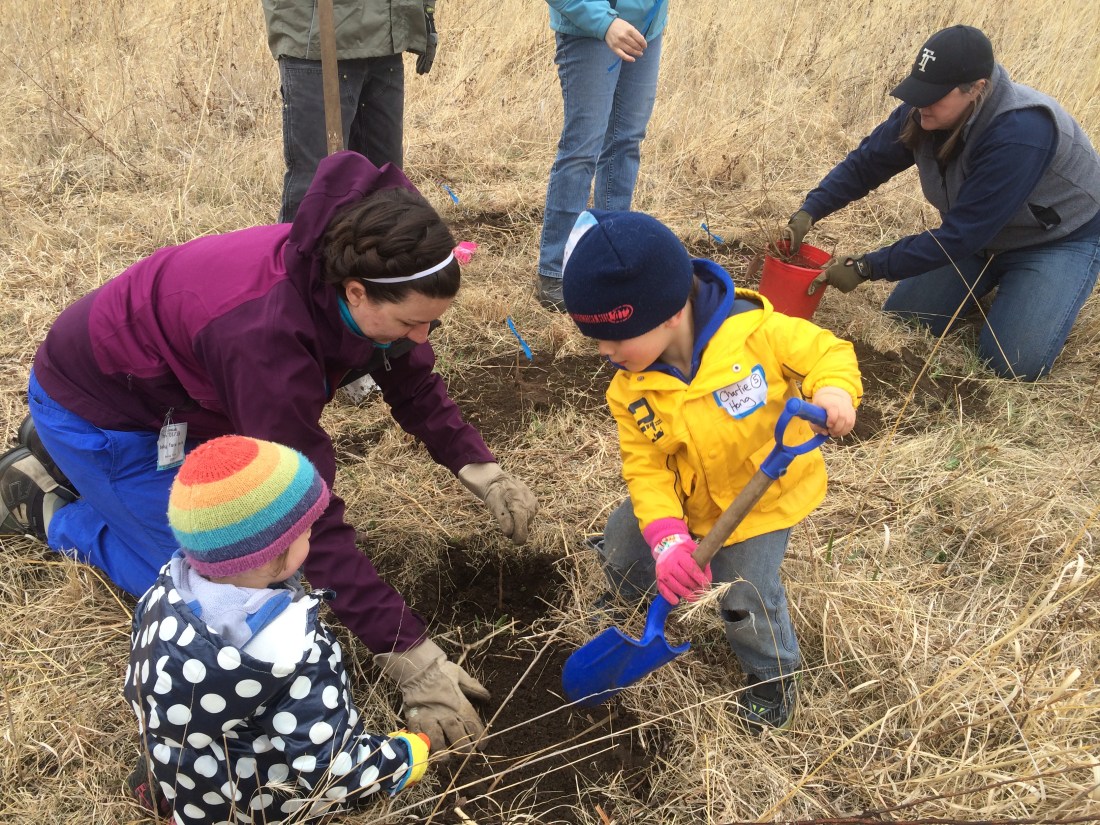 In spite of cold weather and light drizzle this Arbor Day, volunteers still turned out in mass for the tree planting event. We brought a small team from the Washington Conservation District, including my son Charlie – age three, and a co-worker’s daughter Linnea – age two. County Commissioners Lisa Weik and Karla Bigham spoke during the pre-planting ceremony, as did Watershed District managers Jack Lavold and Denny Hanna. Other volunteers included teams from local businesses, as well as area residents who signed up as families and individuals. Charlie and Linnea provided a distraction from the chilling rain, helping to tie little blue ribbons around the new seedlings and collecting earthworms along the way. By the time the oaks we planted begin to produce acorns, Charlie and Linnea will already be in their 30’s, with jobs and lives of their own.