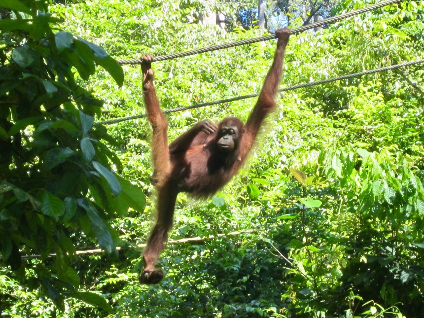 We came to Malaysian Borneo in hopes of seeing wild orangutans – a critically endangered species with barely more than 100,000 animals remaining in Borneo and Sumatra. Over the past 60 years, the population of Bornean orangutans has declined by more than 50% due to loss of habitat, hunting, and illegal wildlife trade. Our first stop on a three day, two night adventure on the Kinabatangan River was the Sepilok Orangutan Rehabilitation Center, where orphaned orangutans are raised and eventually released to a protected forest reserve nearby. Later, we were thrilled to spot a wild orangutan along the river, about two hours inland from the coast.