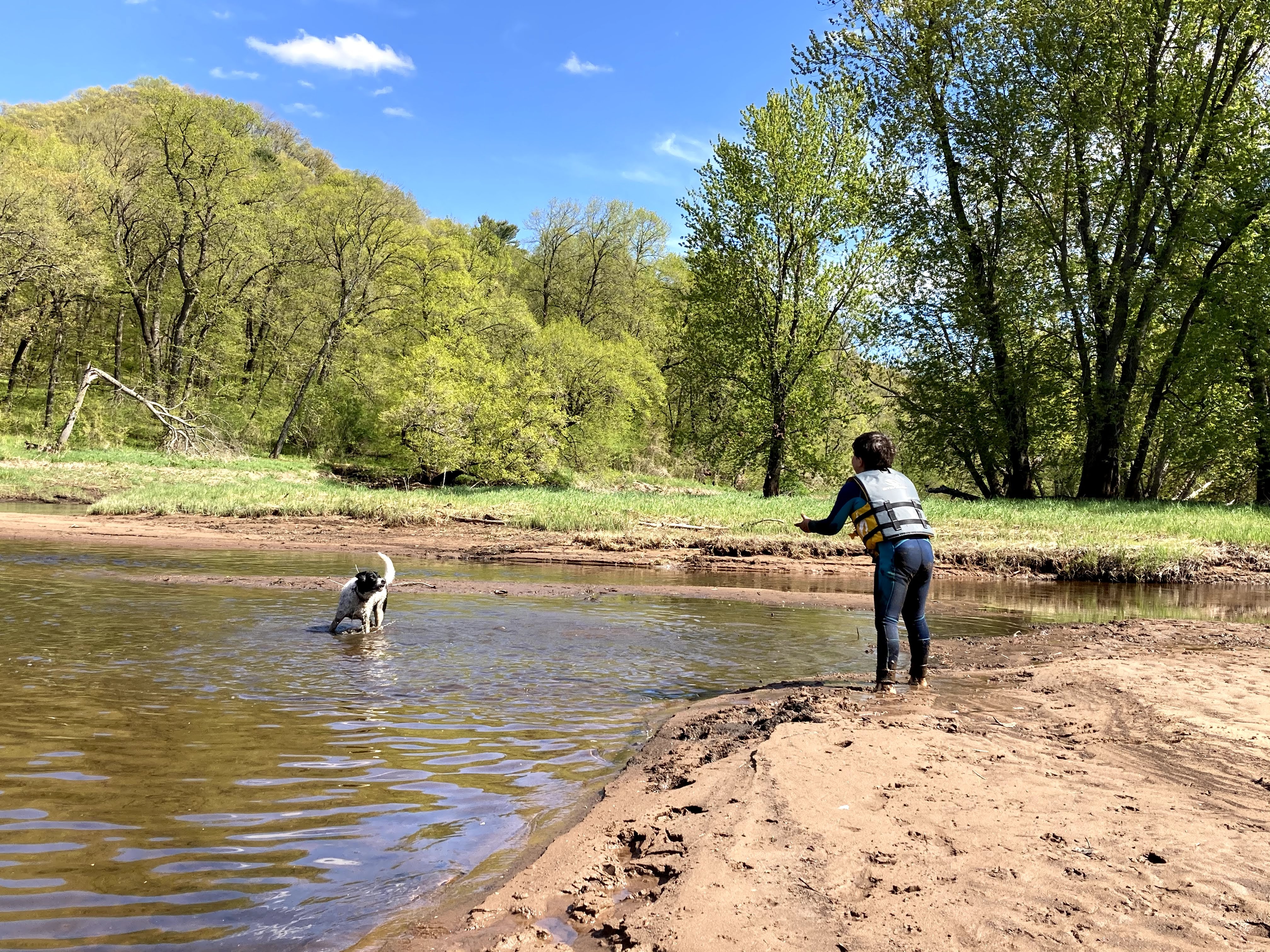 Like any good wilderness adventure, our day featured a stimulating mix of peaceful solitude, surprising discoveries, playful rest time, and harrowing travel. After setting sail, we quickly paddled across the main channel and into a labyrinth of backwater passages that snaked through the floodplain forest. There, the water was shallow and clear. Balancing mother, son and dog, we maneuvered around sandbars and snags, over submerged logs, and through a series of quiet waterways, each one indecipherable from the next.