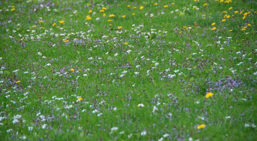 Bee lawns feature a variety of low-growing flowering plants such as white clover, creeping thyme, and self heal, as well as low-mow fine fescue grasses. (Photo from Pollinator Friendly Alliance)