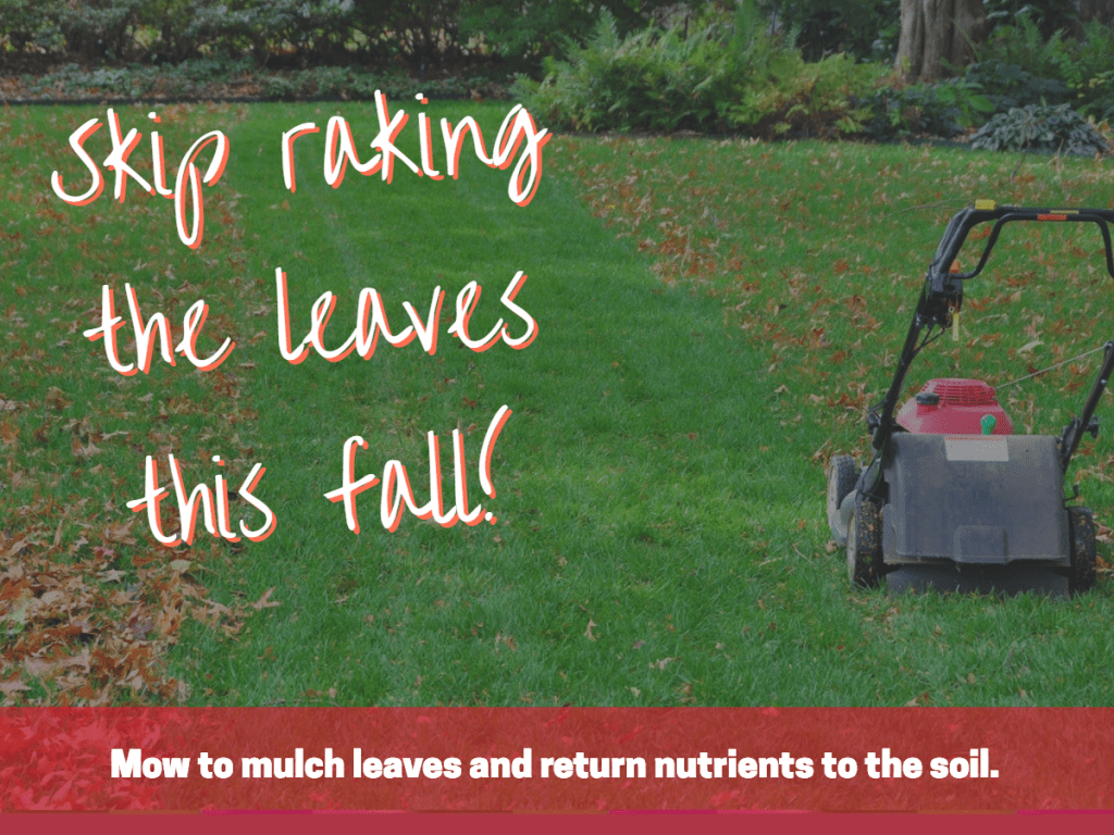 Leaves: Instead of raking leaves, mow your lawn a few times to mulch up the leaves and return nutrients to the soil. Leave the leaves in garden areas as well to provide habitat and protect perennial plants during the winter. However, DO rake leaves out of the street in front of your home to keep them from clogging storm drains and sending nutrients into local lakes, rivers and wetlands when they decompose.
