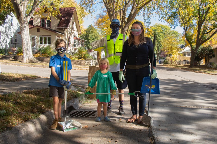 Michelle Spangler and her kids stand in front of a newly cleaned storm drain in Northeast Minneapolis.