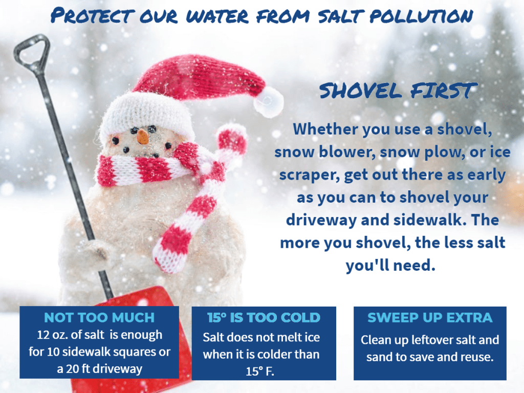 - Drive slower and wear appropriate shoes when it’s snowy and icy outside. This helps to support road maintenance crews and parking lot owners in their efforts to reduce salt use.