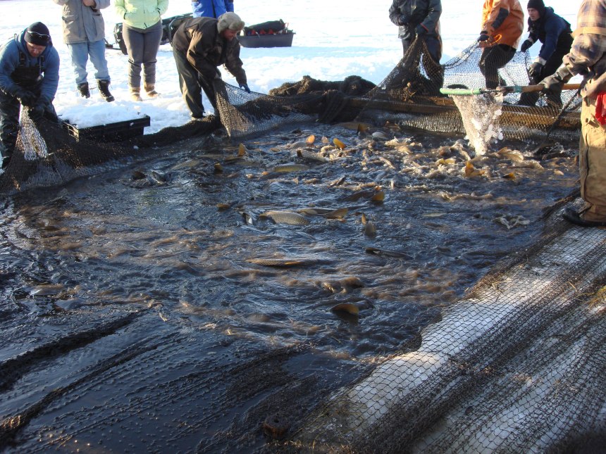 Common carp, which are native to Europe and Asia, were intentionally introduced to lakes in the Midwest as a game fish during the 1880s. Unfortunately, the fish proved to be a highly damaging aquatic invasive species, especially in shallow lakes and wetlands. Carp are omnivorous bottom feeders and have a nasty habit of uprooting aquatic plants. This muddies the water and releases phosphorus that is bound in the lake bottom sediment, causing a cascade of effects, including more algae growth, diminished water clarity, and less food for native fish and waterfowl.