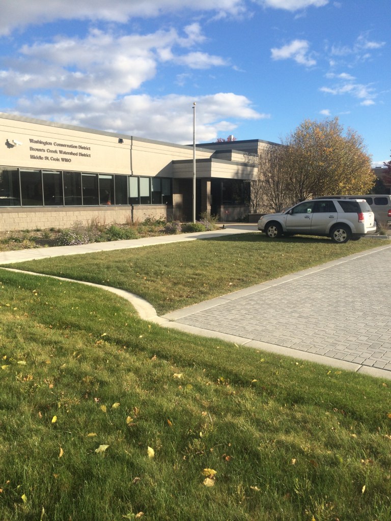 When the Washington Conservation District moved into a commercial business park in Oakdale in 2013, staff began looking for opportunities to reduce stormwater runoff and showcase some lesser-known conservation technologies. They settled on a retrofit design that includes a permeable overflow parking lot with a large raingarden, 5000 square feet of native prairie, native plantings along the building foundation and parking lot entrance, and a demonstration bee-lawn. Believe it or not, the permeable parking lot steals all the attention.
