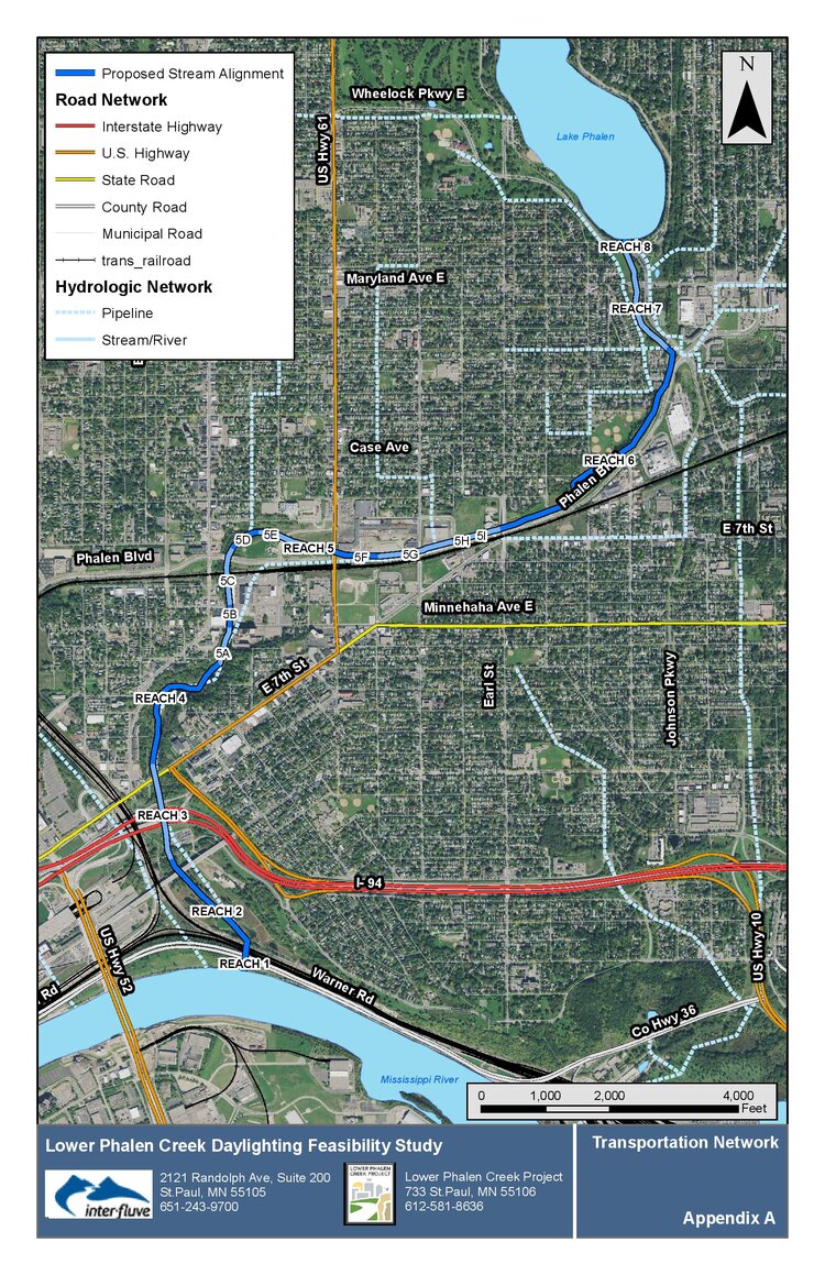 This diagram from Lower Phalen Creek Project shows the proposed stream alignment for Phalen Creek in the future. A feasibility study conducted by Interfluv Inc. found Reach 5 and reach 7 to be the best locations to begin work currently.