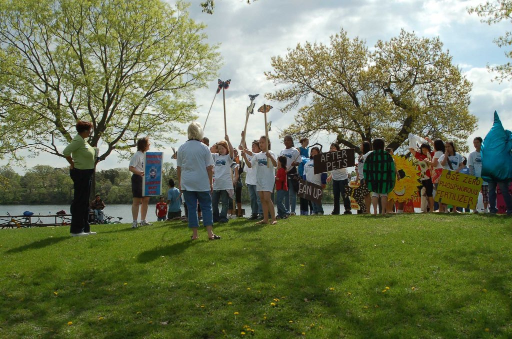 Students from area schools carry signs and puppets during a WaterFest parade at Lake Phalen. Photo from Ramsey-Washington Metro Watershed District.