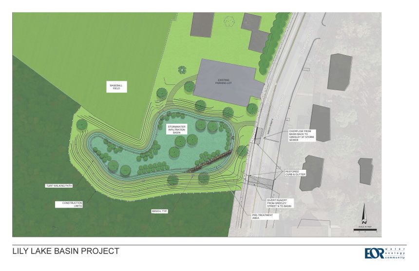Most recently, EOR, Inc. designed and installed an infiltration basin at the south end of Lily Lake Park that collects and treats stormwater from the surrounding area. This “mega raingarden” reduces phosphorus flowing into Lily Lake by 32 pounds per year and was the final project needed to achieve a 145lb phosphorus reduction goal for external loading (phosphorus coming from watershed runoff) that was set in 2006. Both the infiltration basin and the alum treatment are funded, in part, through a $513,500 Clean Water Fund grant from the Minnesota Board of Water and Soil Resources. Additional funding and staff support come from the City of Stillwater and the Middle St. Croix Watershed Management Organization.