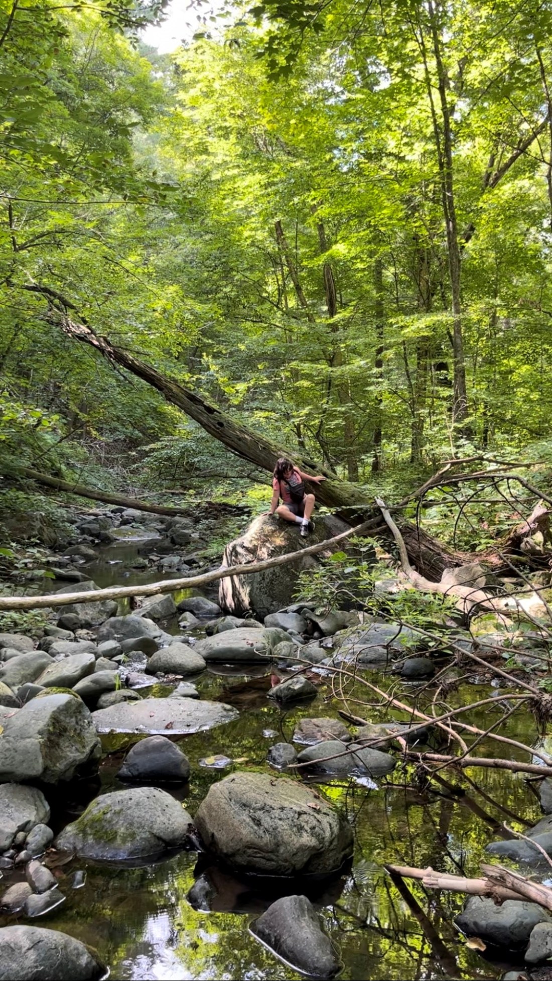 Eventually, we made it down to a stream at the bottom of the hill and began picking our way along, looking for fossils and interesting rocks. In the streambed, we found river rocks, worn smooth by water and time. Ahead, loomed a crumbling sandstone cliff, waiting patiently to tell us of its life as an ocean beach, 500 million years before tiki huts and piña coladas.