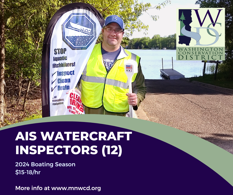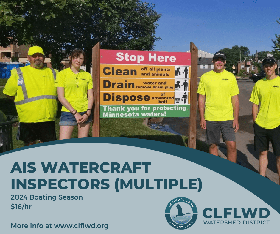 Currently, the WCD and CLFLWD are accepting applications for watercraft inspectors to work at lakes around the county, beginning in May. The positions can be full or part-time and include evenings, weekends, and early mornings hours. The job is 95% outdoors and is well-suited for recent high school grads, college students and teachers on summer break, and retirees looking for extra income. More info at www.mnwcd.org/employment-opportunities or www.clflwd.org/employment.