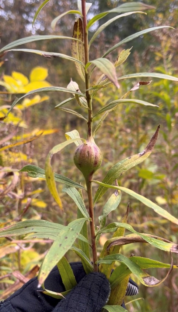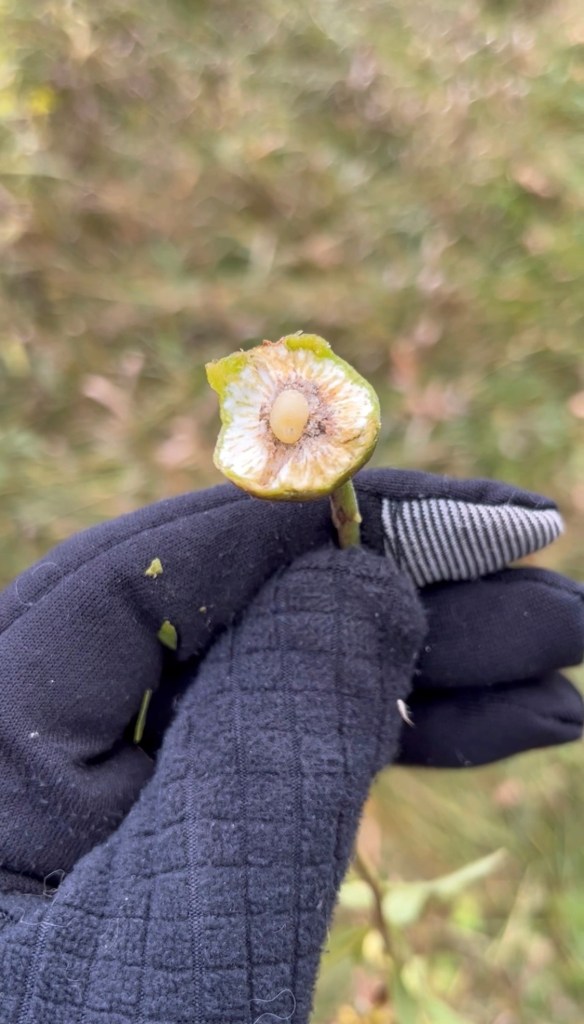 Here is where we finally arrive back at the maggot I pretended to eat! If you’ve ever been out hiking in a prairie full of goldenrod, you may have noticed that some of the goldenrod plants have round balls in the middle of their stems. There is a species of fly called the goldenrod gall fly, Eurosta solidagnis, that completes its entire life cycle only on goldenrods. The females lay their eggs inside the goldenrod stems in the spring and, because that annoys the plant, it forms a ball around the larva as it grows. Chickadees and woodpeckers will drill into the goldenrod galls to eat the larva inside, and if you have a pocketknife or a sharp set of teeth, you can also open the gall to get at the larva. Some people even use them for ice fishing.