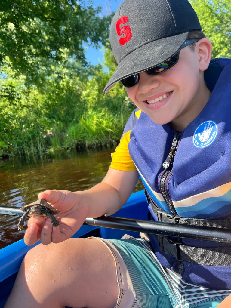 The Namekagon River is located in northwestern Wisconsin and flows 101 miles from the Chequamegon–Nicolet National Forest to the St. Croix River, ending a few miles northeast of Danbury. It is the St. Croix’s longest tributary. The name “Namekagon” comes from the Ojibwe word Namekaagong-ziibi, which means “river at the place abundant with sturgeons.” In fact, my son Charlie was lucky enough to see one of these enormous fish while we were paddling between Howell and McDowell Landings. He described it as being 3-4 feet long and almost a foot wide, with three little white fish attached to its body, diamonds down its back, and whiskers on its mouth.