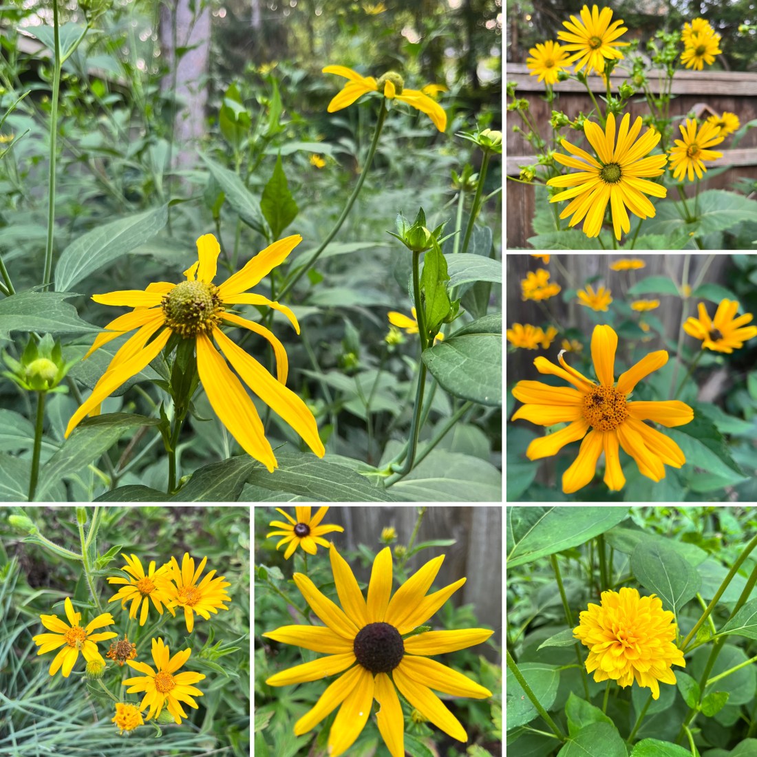 Once the yellows begin blooming, they quickly take over the gardens in every corner of our yard. If I look out my dining room window, I can see bright yellow goldfinches perched on the bright yellow flowers of the cup plant in our driveway. Outside my backdoor, the woodland sunflowers spill out of the raingarden and onto our porch. In the front boulevard, brown and black-eyed Susans compete for attention in a sea of golden asters.