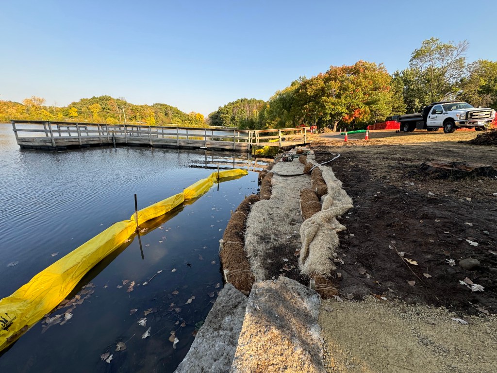Though shoreline restoration is similar in many ways to other native plantings, these types of projects are usually more expensive and require special materials, such as biologs, temporary wave breaks, and erosion control blankets, to help protect the trees and plants until they are fully established. Biologs are made out of shredded coconut fibers that are bound together inside of a casing (sort of like a sausage) and are staked into the ground right at the water’s edge. Temporary wave breaks are placed a few feet further out into the water, and erosion control blankets (also made from coconut fibers) are laid over the bare soil along the shoreline to retain moisture, prevent erosion, and minimize weed growth. The blankets and biologs are left in place after planting and naturally break-down over time.