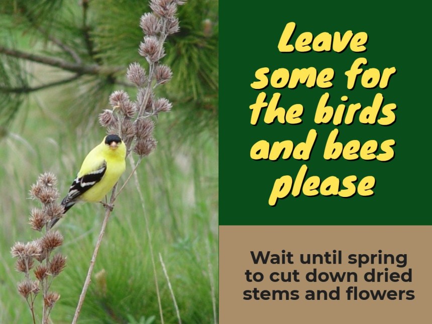 The first is to dedicate yourself to lazy landscaping strategies. Instead of cutting down dried stems and flowers in your gardens, leave them standing until the spring. The seed heads will provide food for birds during the winter and the hollow stems will create cozy winter homes for bees and beneficial insects.