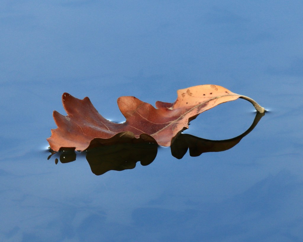 One of Lilja’s favorite images from her artist residency is a winter scene at Wilmes Lake in Woodbury, which she photographed in black and white. “There was so little snow last winter, and it made it hard to find beauty sometimes. But the red oaks around the lake created a beautiful accent.” Another set of images that Lilja is fond of are two photos of oak leaves balanced on the water’s surface at Colby Lake. “It was a grey day but a fun discovery to see those leaves floating so perfectly.”