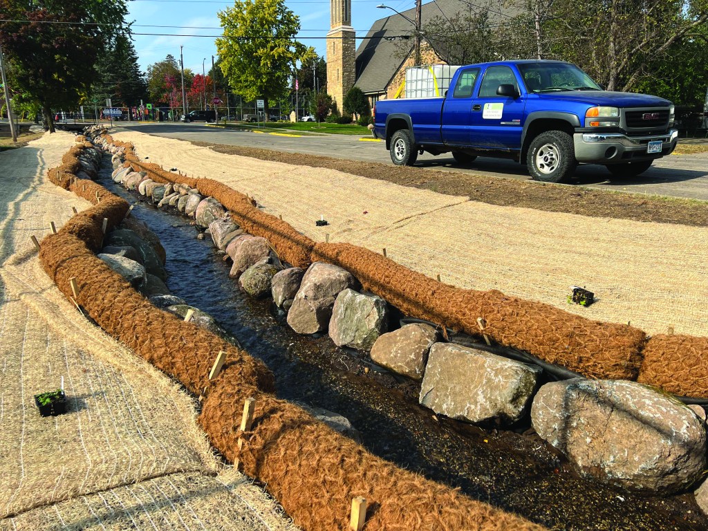 Previously, in 2017, MSCWMO worked in partnership with the City and private landowners to build three curb-cut raingardens in town and plant 100 feet of native streambank buffer in Perro Park. Local Girl Scouts helped to plant and maintain the buffer as part of their work towards Silver Awards.