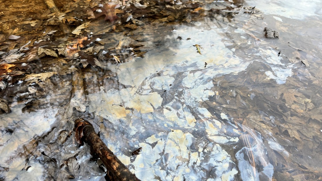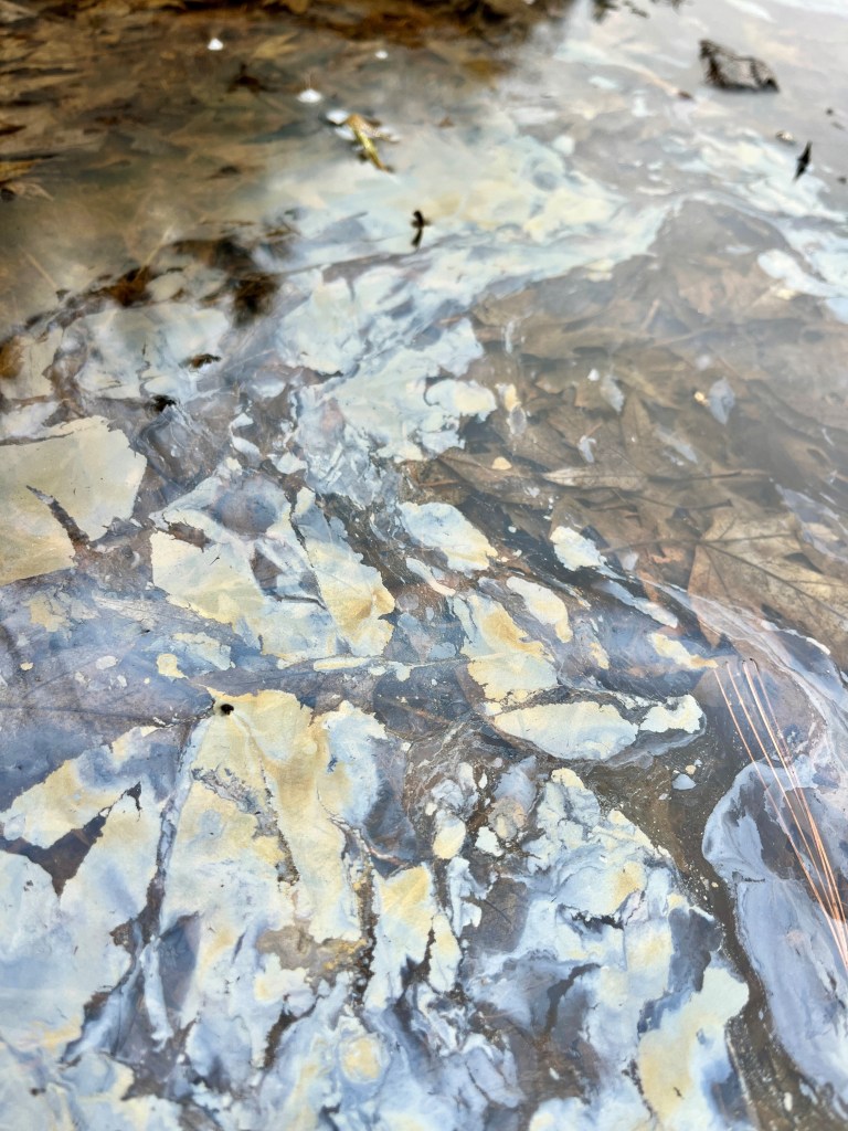 Natural sheens can also be caused by iron-decomposing bacteria that feed off of iron deposits in the soil and rocks near the water. In this example, the rainbow effect is not caused by natural oils, but rather by tiny platelets that coalesce on the water’s surface and create a thin reflective film, sort of like a mirror. These sheens are common in groundwater-fed streams and wetlands, like the one my son and I explored last week. If there is an exceptionally high iron content in the water, it will sometimes turn orange as it oxidizes or even create a nasty looking orange goop.