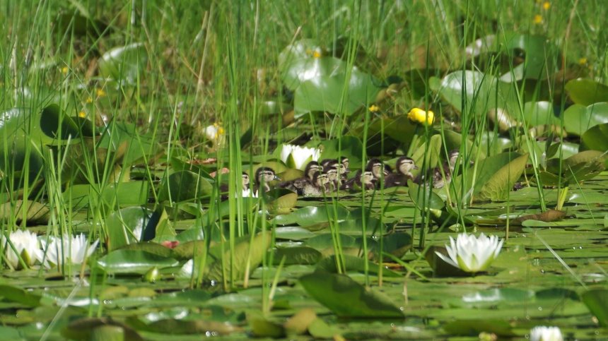 The water’s edge is alive. Herons, ducks and other birds nest near the shore to fish, skim for insects, and hunt for frogs and crayfish. Turtles sun themselves on fallen logs during the summer and bury themselves in mud along the bank during the winter. Fish spawn and lay their eggs in the shadows of fallen logs. By the water’s edge, children laugh and chase frogs while anglers in nearby boats wait patiently for a bite.