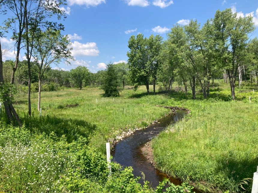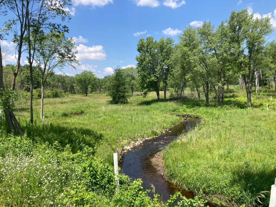 Key components of Brown’s Creek’s most recent stream restoration project include re-creating a natural stream channel and floodplain to provide better provide habitat for fish and buffer against large rain events. The system is designed to handle 7.2 inches of rain in a 24-hour period of time (sometimes known as a “100-year storm event”). Last winter, crews cleared buckthorn from the woodlands surrounding the creek and, this spring, more than 60 volunteers helped to plant over 200 native trees and shrubs in the restoration area.