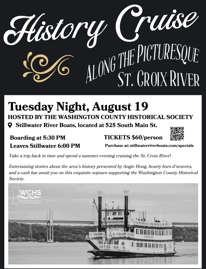 What other stories does the St. Croix River have to share? To learn more, join me for a scenic cruise along the river near Stillwater on Tuesday, Aug. 19, 5:30-8pm. The event is hosted by the Washington County Historical Society and tickets are available at stillwaterriverboats.com/specials.
