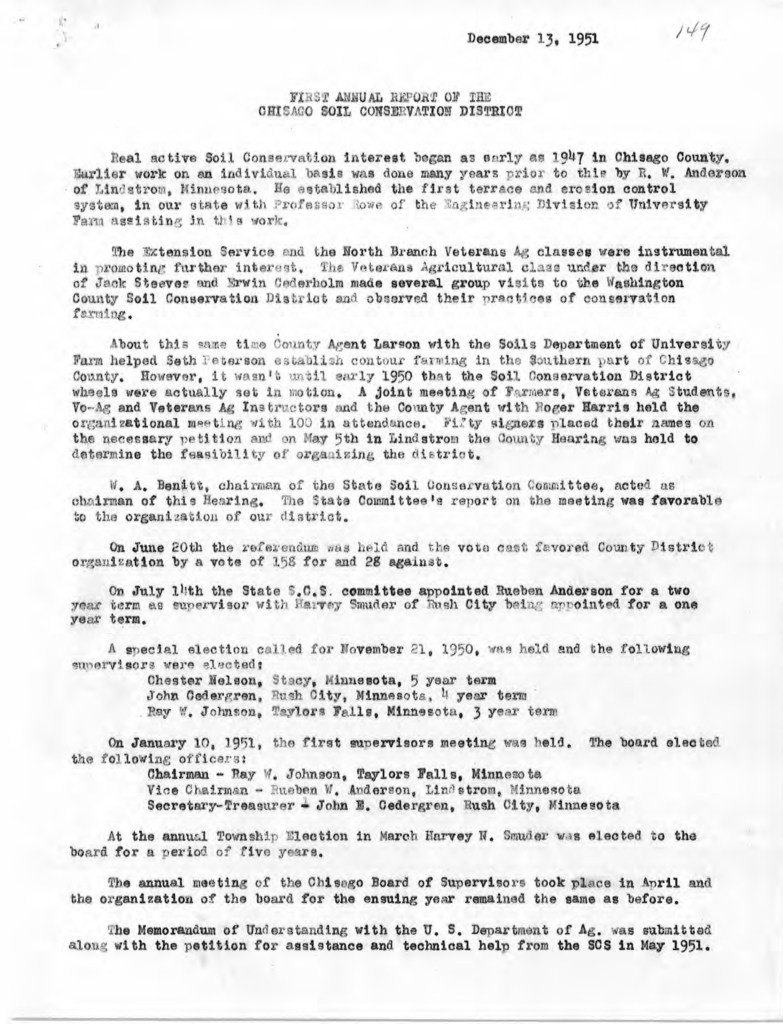 After joining the SWCD board, Rick was pleasantly surprised to learn that his family actually has a long-standing connection with the organization. When the Chisago SWCD was established in 1950, Rick’s great uncle John Cedergren was elected as one of the first three board supervisors and served as board secretary. John’s experience propelled him toward a career in conservation, and he went on to work for the Blue Earth SWCD in Mankato after it was established in 1959.