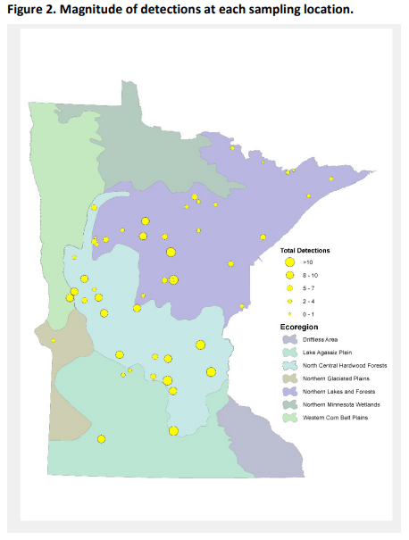 The most commonly found chemical was the hormone estrone (70% of tested lakes), followed by the insect repellent DEET (76% of tested lakes in 2011 and 50% in 2017). Other chemicals, including cocaine, antidepressants, oxycodone, and veterinary antibiotics were detected in numerous lakes as well. In fact, of the 163 chemicals tested by the MPCA, 55 were found in at least one lake. (See: Pharmaceuticals and chemicals of concern in Minnesota lakes, MPCA, 2021)